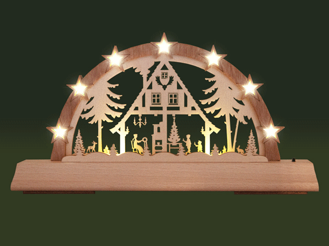 14 eingearbeitete LED's im warm-weißen Farbton sorgen für ein gemütliches und heimliches Ambiente. Die LED's strahlen jeweils nach vorn und nach hinten. Durch den aufgeworfenen Bogenkranz ergibt sich ein schöner Tiefeneffekt. Zwei zusätzliche LED's im Sockel strahlen das Motiv an für einen besonderen Blickfang.