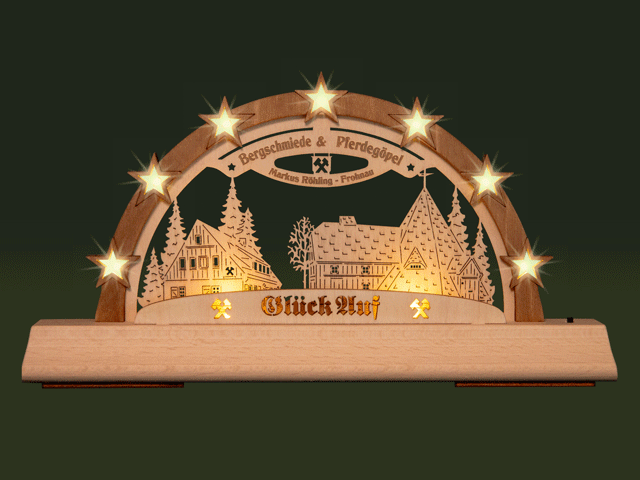 14 eingearbeitete LED's im warm-weißen Farbton sorgen für ein gemütliches und heimliches Ambiente. Die LED's strahlen jeweils nach vorn und nach hinten. Durch den aufgeworfenen Bogenkranz ergibt sich ein schöner Tiefeneffekt. Zwei zusätzliche LED's im Sockel strahlen das Motiv an für einen besonderen Blickfang.