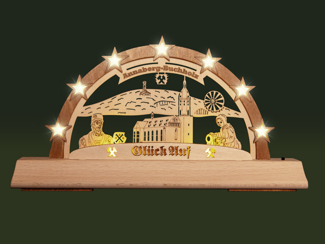 14 eingearbeitete LED's im warm-weißen Farbton sorgen für ein gemütliches und heimliches Ambiente. Die LED's strahlen jeweils nach vorn und nach hinten. Durch den aufgeworfenen Bogenkranz ergibt sich ein schöner Tiefeneffekt. Zwei zusätzliche LED's im Sockel strahlen das Motiv an für einen besonderen Blickfang.