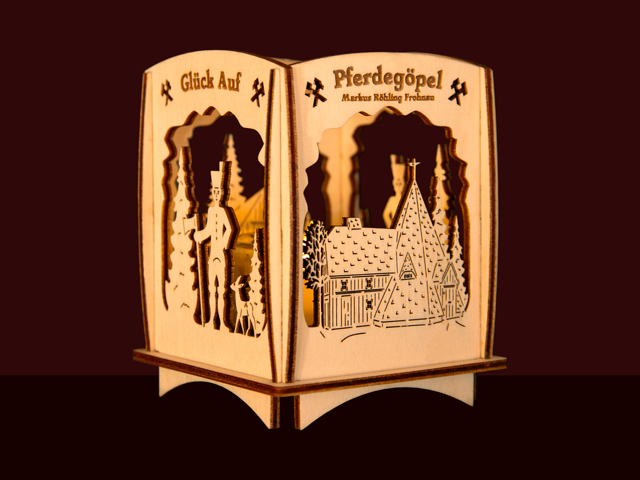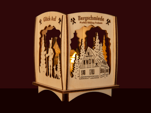 Filigraner Teelichthalter mit Holzmotiven;