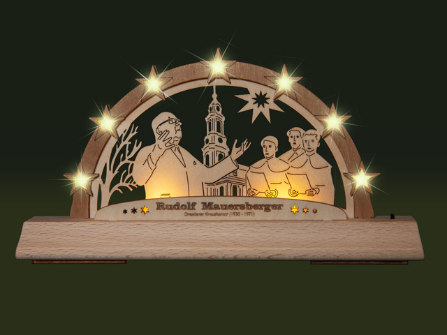 14 eingearbeitete LED's im warm-weißen Farbton sorgen für ein gemütliches und heimliches Ambiente. Die LED's strahlen jeweils nach vorn und nach hinten. Durch den aufgeworfenen Bogenkranz ergibt sich ein schöner Tiefeneffekt. Zwei zusätzliche LED's im Sockel strahlen das Motiv an für einen besonderen Blickfang.